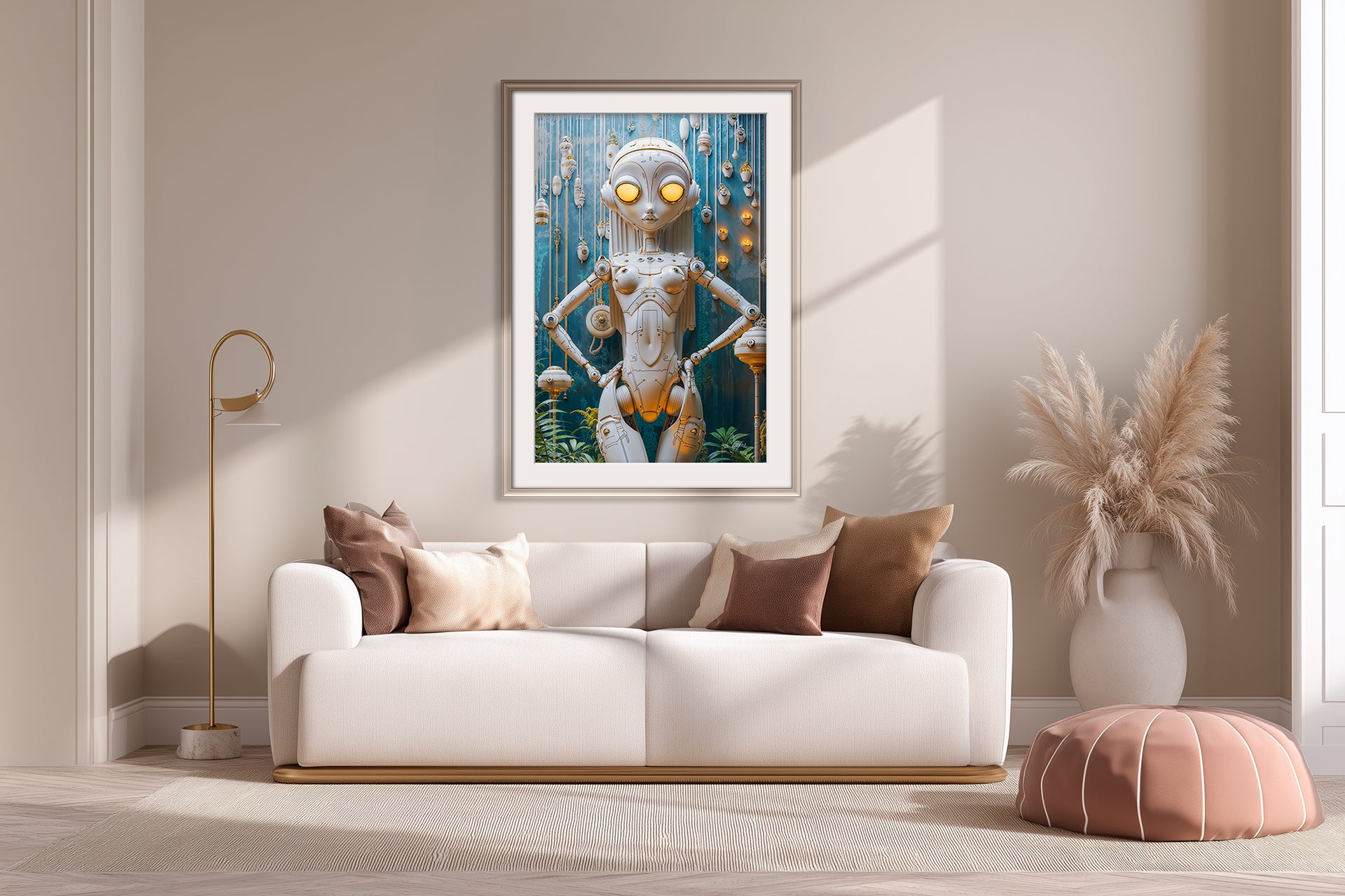 "Strangely Beautiful No. 2" – A tall, commanding android presence with radiant golden eyes and wide-set stance. The wall behind glitters with suspended relics, evoking both laboratory and cathedral. She is both specimen and saint, a luminous figure of dominance and allure.