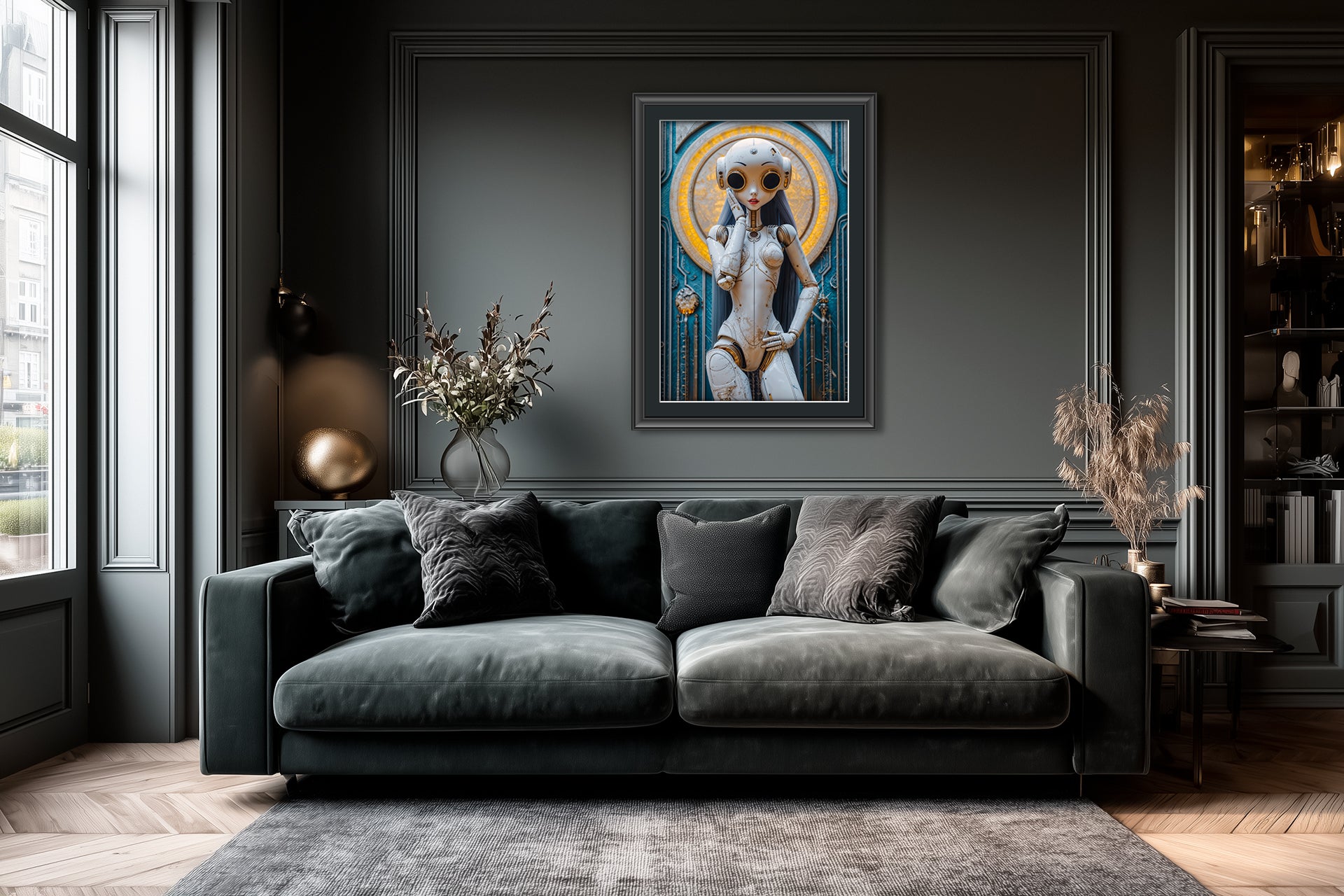 "Strangely Beautiful No. 5" – A delicate android girl with soft expression, framed by a glowing halo. Her poised gesture evokes intimacy, as though caught mid-confession. Worn metal accents suggest time and memory embedded within the dreamlike figure.