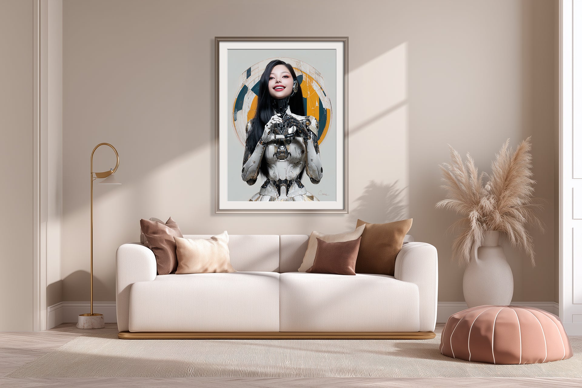 Art Style: The piece draws from Art Deco geometry and the ethereal stylization of symbolist portraiture, layered with contemporary photorealistic rendering. The smooth contrasts between chrome surfaces and human hair evoke a fashion-photography sensibility, merging couture with cybernetics. The circular motif recalls religious icons, reinterpreted for a technological age.