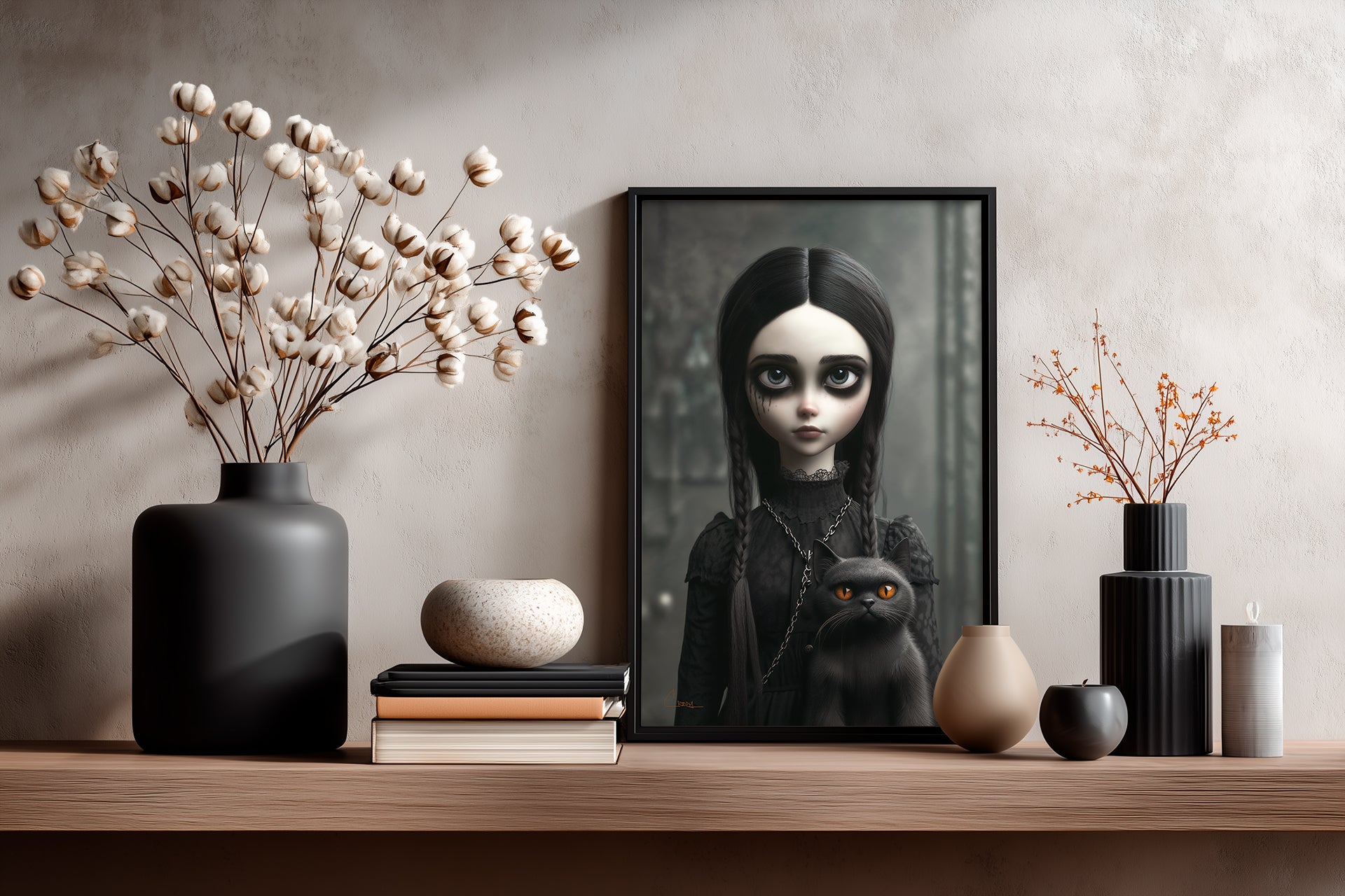 Art Style: Gothic portraiture, surreal cat symbolism, Burton-esque stylization, doll-like realism.
