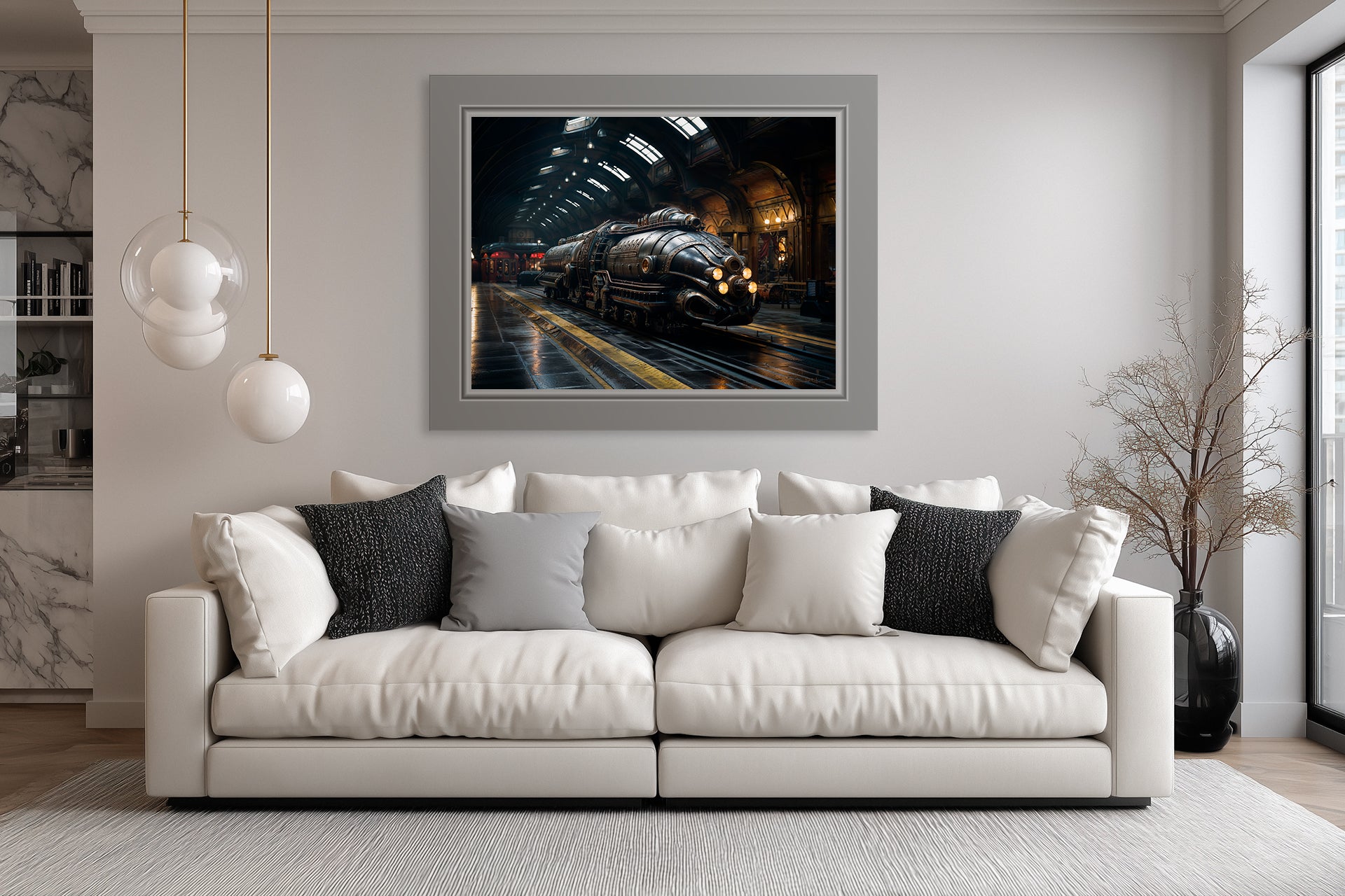 "Unretro Mechanica No. 11" – A streamlined engine crouches in shadows, its riveted body glowing with light. It feels alive, like a whale or beast of burden, breathing steam. Its surreal smoothness edges toward the alien.