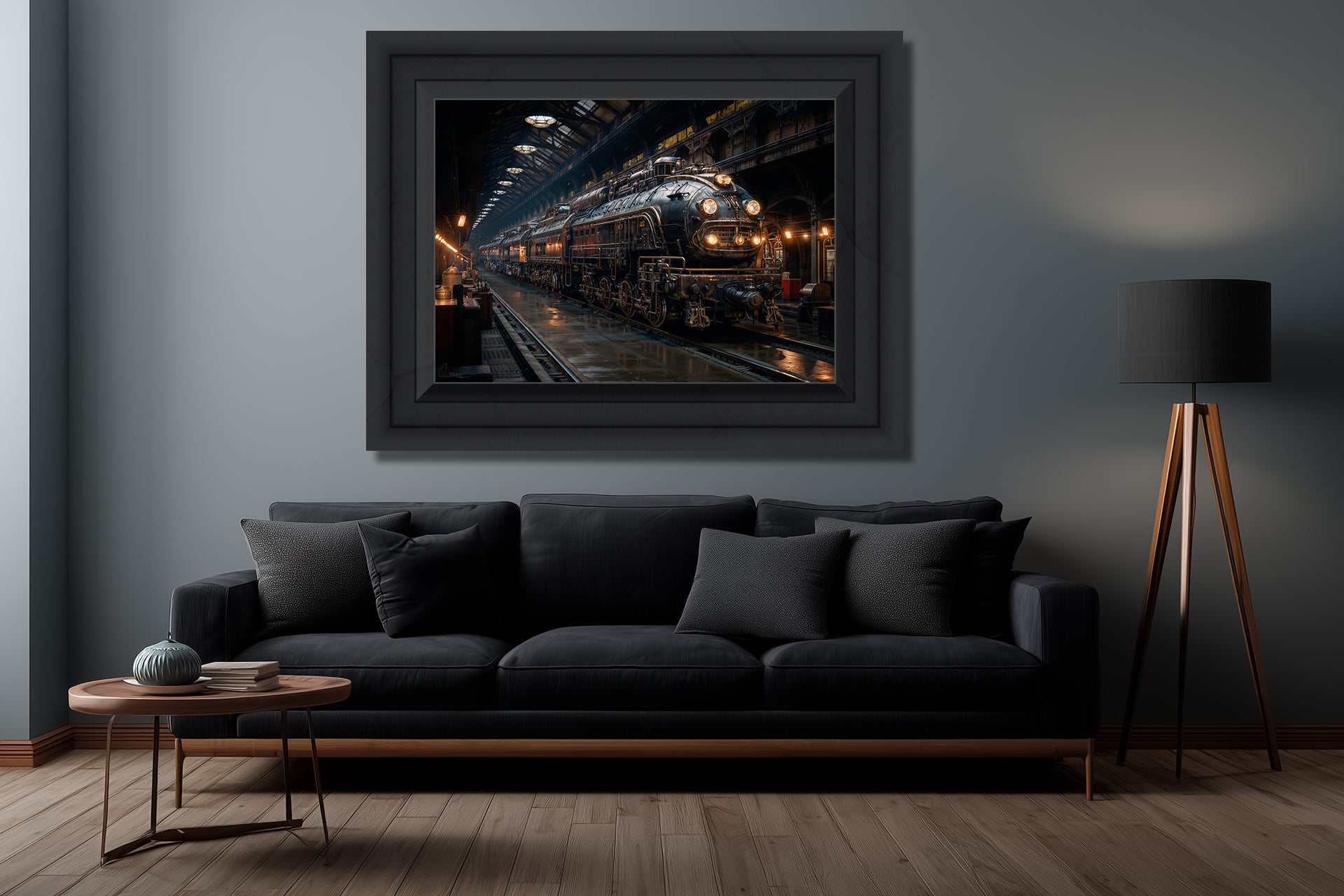"Unretro Mechanica No. 16" – A locomotive with face-like features beams a surreal grin, turning steel into character. It blends whimsy with menace, embodying the hallucinatory edge of the series.