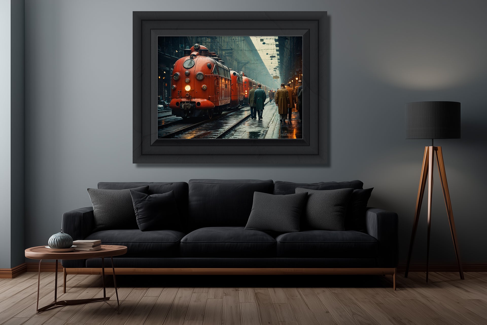 "Unretro Mechanica No. 6" – Rain-slicked streets and men in coats surround a red bullet-like train, more creature than vehicle. The urban mood feels cinematic, a scene out of an alternate-history noir where machines hum with secrets.