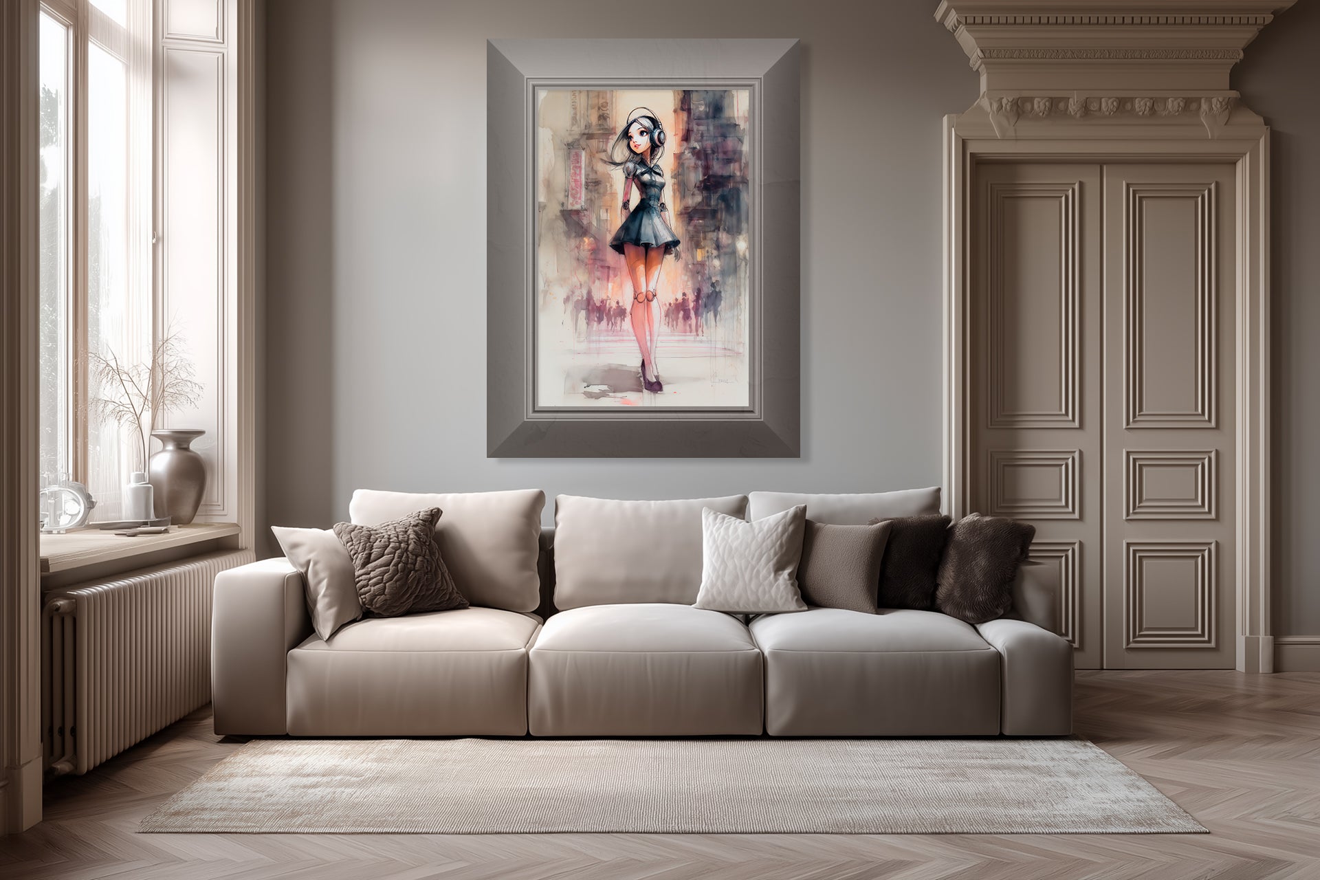 "Uptown Girl" – An elegant cyborg strolls in a fashionable black dress, set against a dreamy watercolor city backdrop. Her body is chrome and polymer, but her spirit is pure cosmopolitan chic. She embodies the android as urbanite — stylish, confident, blending into the city crowd while standing out with grace.