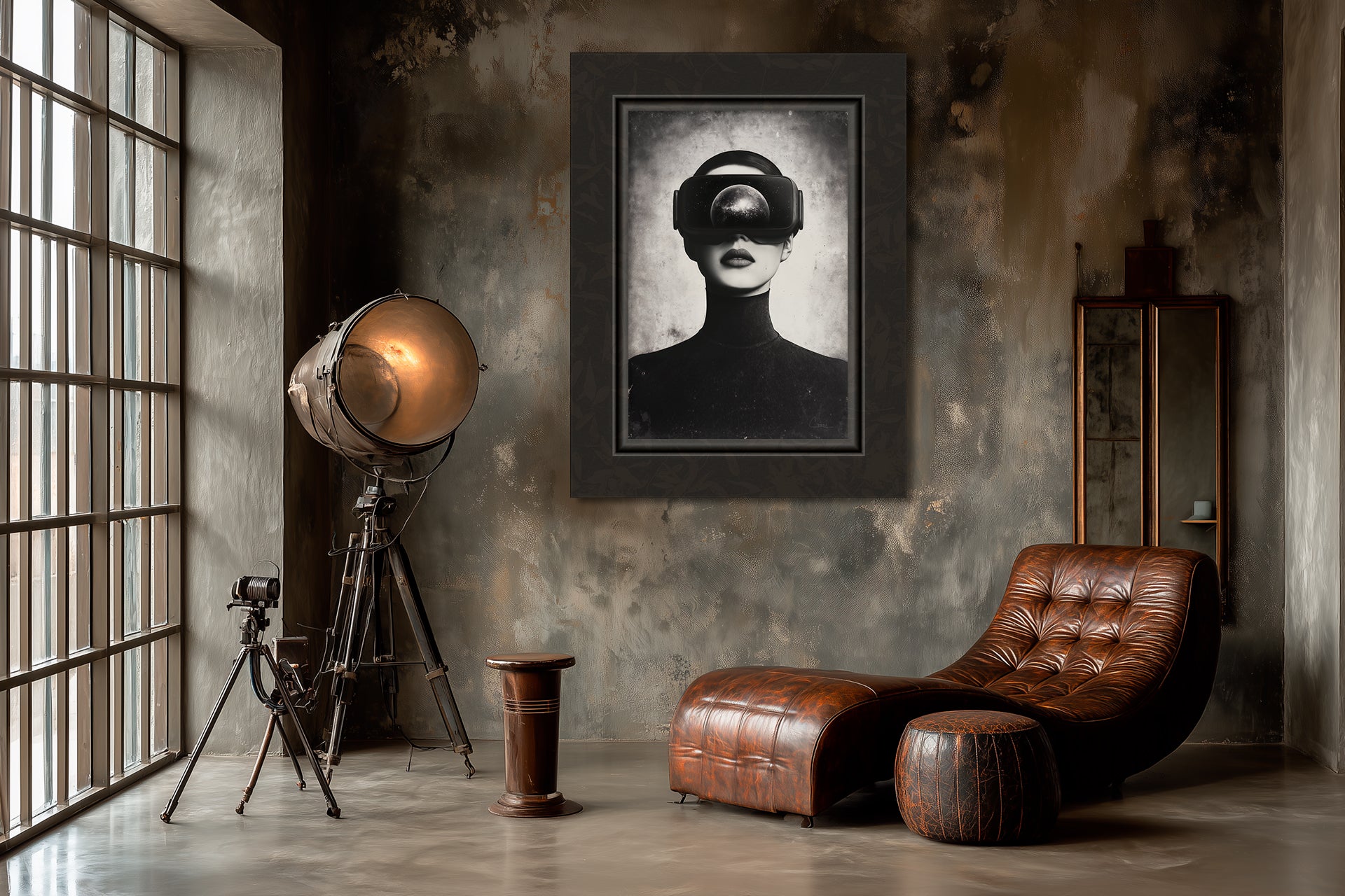 "VR Vision No. 1" – Cosmic Threshold. A stark portrait of a woman in VR, her headset reflecting a luminous planet suspended in endless darkness. A surreal exploration of perception and infinity.