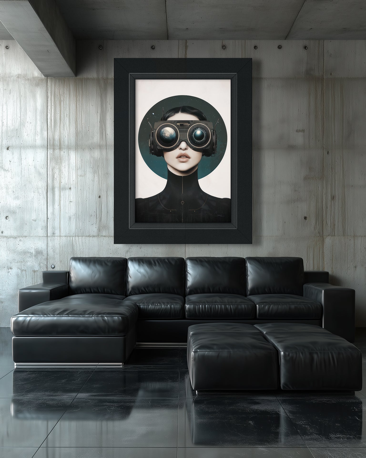 "VR Vision No. 8" – Astral Observer. A futuristic portrait where heavy retro-style goggles reflect twin celestial bodies. A blend of cosmic awe and machine-age mystery.