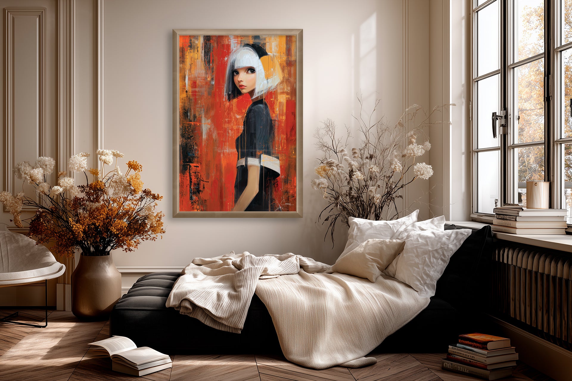 Art Style: Painterly geometric abstraction fused with figurative portraiture. The textured, layered background evokes raw urban energy and color-field abstraction, while the girl is rendered with smooth, anime-inspired features that contrast sharply with the gestural brushwork. The juxtaposition creates a cinematic, modern aesthetic — at once vibrant and introspective.